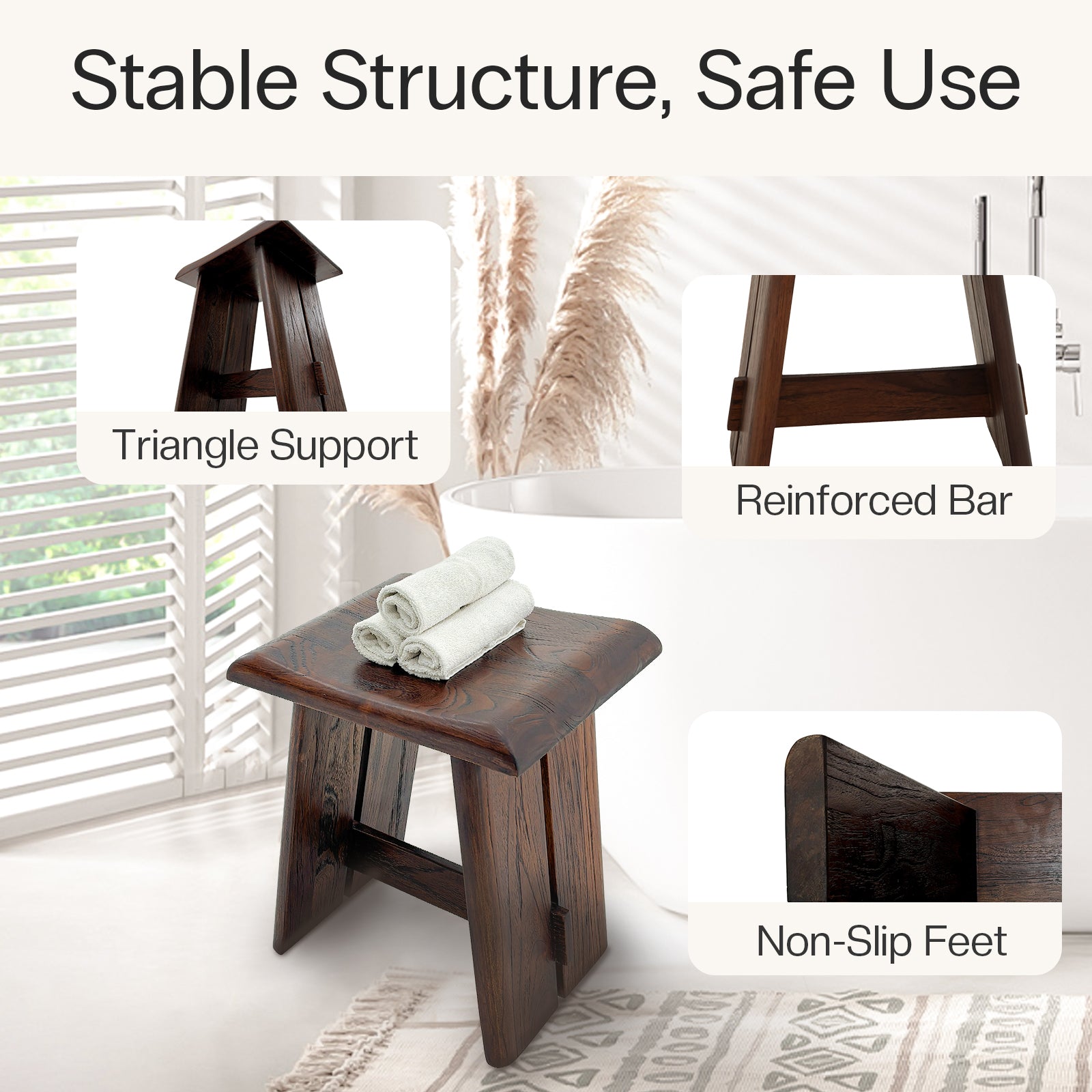 - Compact, Multi-Purpose Design: Perfectly sized to fit tight spots, this stool works as a shower seat, entryway bench, plant stand, or a stylish accent piece. Its minimalist look and warm wood tone complement any décor, from modern to rustic.